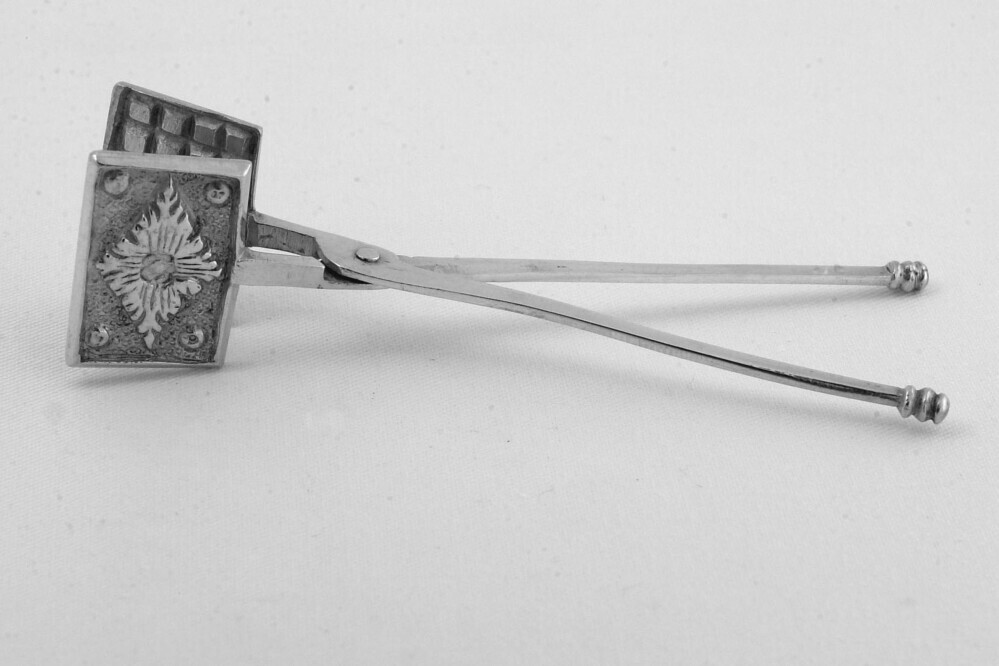 Wafelijzer met twee rechthoekige platen die aan beide zijden zijn versierd met een ruitvormig bladfiguur met punten in de hoeken, de binnenzijde met wafelruit, geklonken draaipunt, benen eindigend in een dubbele knop.