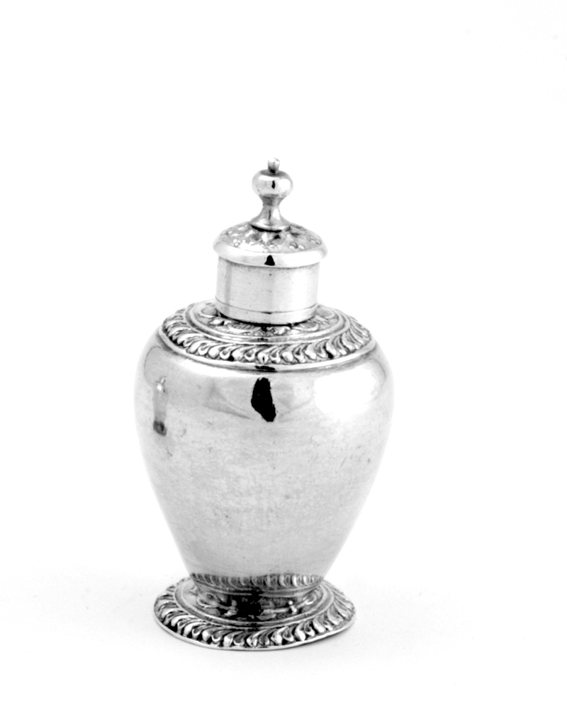 Vaasvormig lichaam met gladde wand op de bovenzijde versierd met knorlijstrand, staande op een ronde dito versierde voet, cilindervormige hals met dito deksel met een gegraveerde lijn langs de onderzijde; de bovenzijde gewelfd en versierd en bekroond met balustervormige knop.