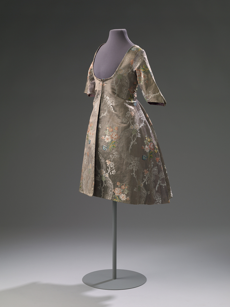 Jak van gedessineerde zijde met een bloem-, blad- en slingerend kant motief. Lage ronde hals. Halflange mouwen met een puntje voor de ellenboog. Op de rug geen stolpplooien. Lange schoot, in de vorm van een halve cirkel. Het jak is geheel gevoerd met donkerpaarse geglansde wol (grein).