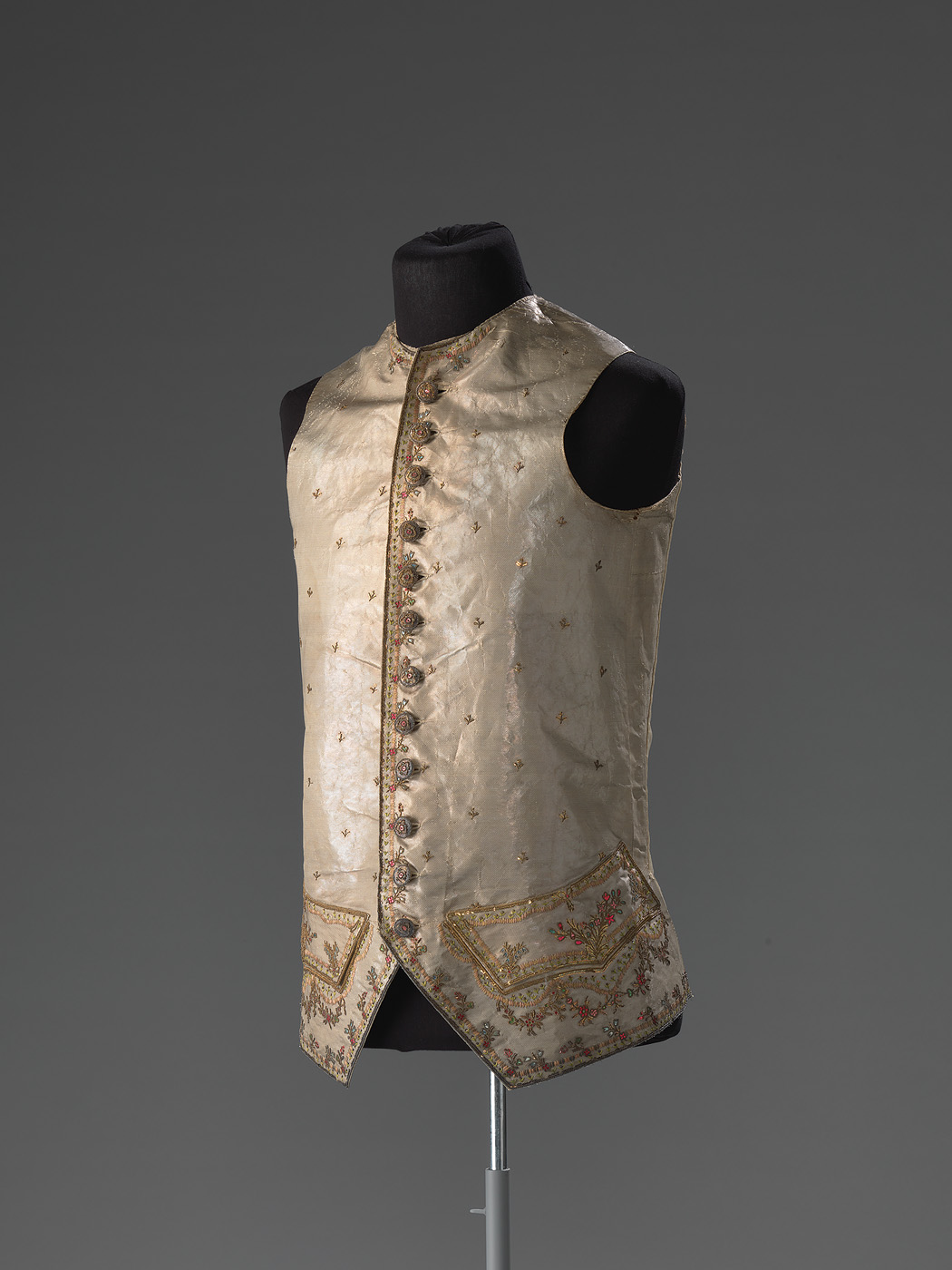 Het mannenkostuum bestaat in de achttiende eeuw uit een jas met bijpassende kniebroek en een in kleur contrasterend vest. De vroegste vesten zijn lang (net als de jas tot op de knie) en slank met een lange rij knopen. Geleidelijk veranderen de vesten van model. Rond 1770 zijn de voorpanden van de vesten ronder weggesneden en korter, totdat het meer rechthoekig weggesneden pand in de jaren zeventig modieus wordt. De halzen zijn in eerste instantie rond en laag, maar krijgen rond 1780 een boord. Deze worden steeds hoger, tot ongeveer zeven centimeter rond 1800. Van achteren worden de vesten doorgaans met een veter bijeengehouden, zodat het vest mooi strak om het lichaam past.