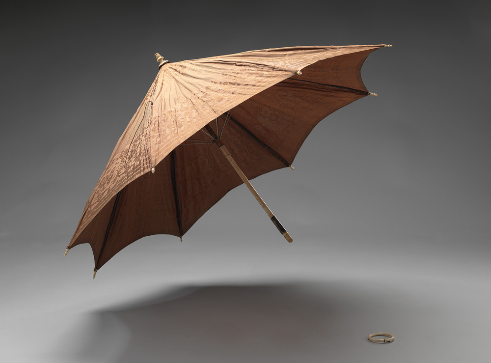 Paraplu met bewerkte ivoren steel, waarvan een gedeelte ontbreekt, bovenste gedeelte van hout. Het dek is van bruine zijde, met ingeweven randmotieven, met dezelfde rand langs bovenkant. Geen voering, top met gevord met klein bruin-wit geruite rond gedeelte. Op het dek een benen bewerkte knop, met bovenin schroefdraad. Halverwege het dek een koord met daaraan een benen ring, om de paraplu te sluiten. Spaken van balein en uitlopend in benen knoppen.
