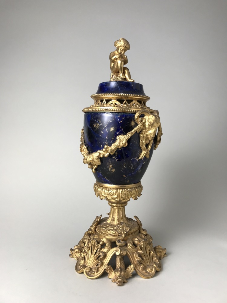 Beker van donkerblauw, goud geaderd porselein, versierd met twee bronzen ramskoppen en guirlandes, op opengewerkte voet met vier dolfijnen en rocaille motief. Deksel met kinderbeeldje.- Trefwoorden