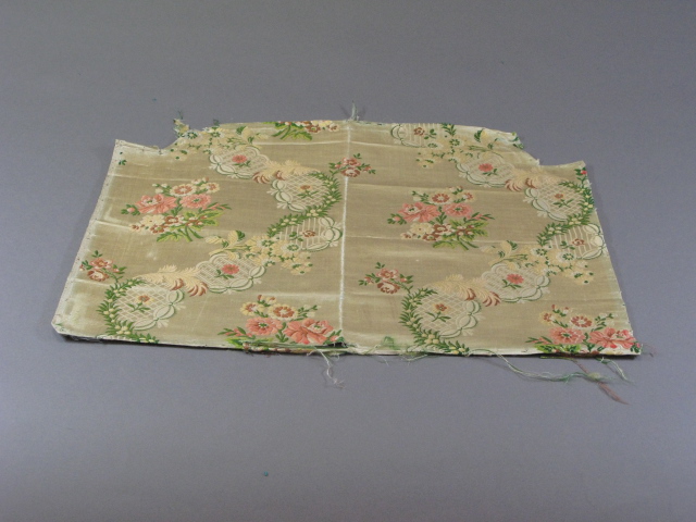 Fragment bekledingsstof. Creme-kleurig, ripszijde ondergrond met ingeweven bloempatronen, met oa rozen, slingers met roze en bruine bloemen. De ranken zijn donkergroen, net zoals de bladeren. Links is een zelfkant.- Trefwoorden