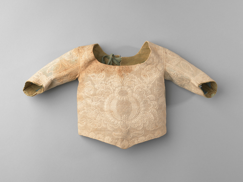 Babyjakje van Zaans stikwerk, gecombineerd met fijn wit borduurwerk. Het borduurwerk sluit bij het patroon van het jak. van voren puntig toelopend met lange mouwen. Voering van lichtblauwe en groene tafzijde. Sluiting middenachter met drie lintjes van hetzelfde tafzijde.