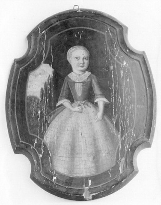 Schildvormig, even gebogen, ovaal met ingeschulpte hoeken. Voorstelling: een staand klein meisje ten voeten uit. Mutsje op het hoofd, geruit schortje, bloem in de hand. Op de achtergrond een landschap door een raam zichtbaar