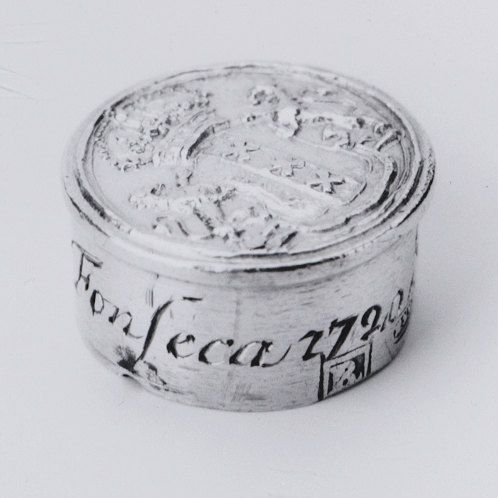 Cilindervormige dop van makelaarsstokje. Rechte, gladde wand met vlakke, licht geprofileerde rand langs bovenzijde. Op bovenzijde op geruwde ondergrond het gekroonde wapen van Amsterdam, gehouden door twee leeuwen. Op - later ingekorte - wand is gegraveerd: Sabetaj Dias da Fonseca 1720/.