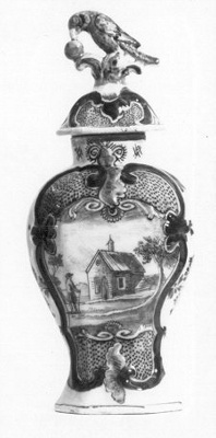 vaas van een 5-delig kaststel. Wandelaar bij een huis. Vogel als dekselknop- Trefwoorden