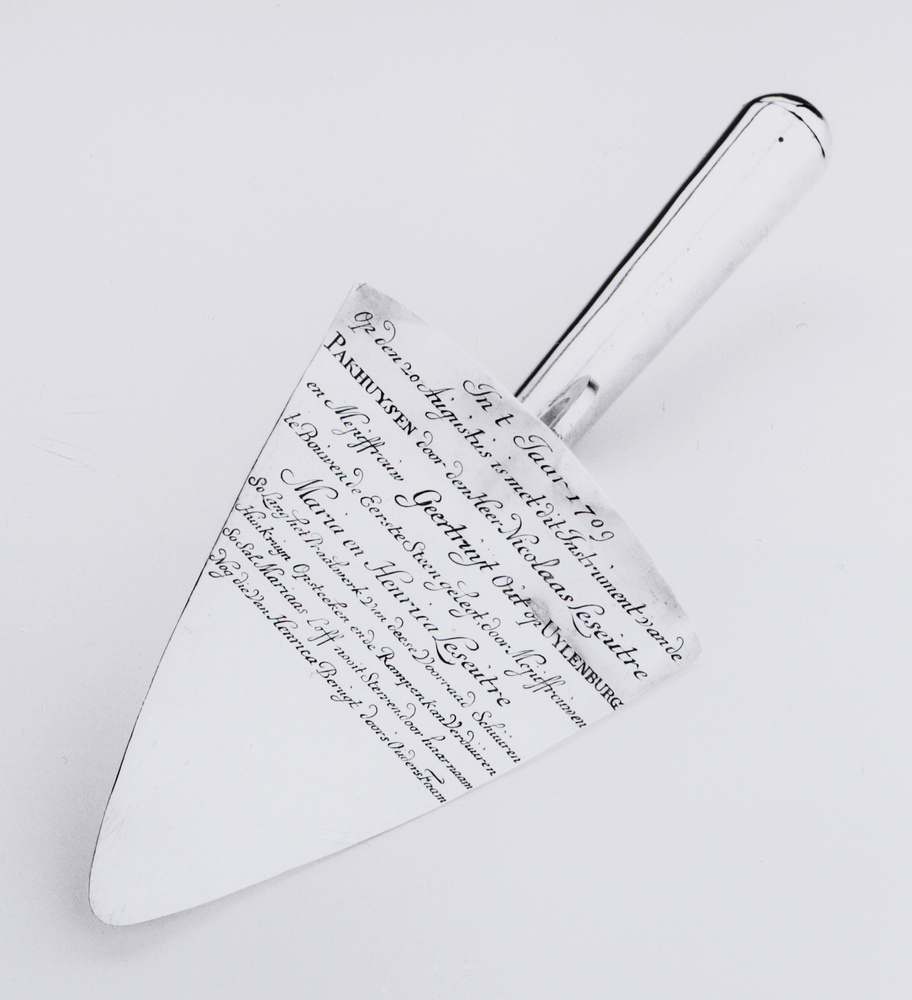 Troffel met driehoekig blad en gebogen zijden, S-vormige steel en rond, taps toelopend zilveren handvat met afgerond uiteinde. Bovenzijde blad glad. Op onderzijde blad is gegraveerd: In 't Jaar 1709/ Op den 20 Augustus is met dit Instrument van de/ PAKHUYSEN door den Heer Nicolaas Leseutre/ en Mejuffrouw Geertruyt Out op UYLENBURG/ te Bouwen de Eerste Steen gelegt door Mejuffrouwen/ Maria en Henrica Leseutre/ So Lang het Praalwerk van deese Voorraad Schuuren/ Hun kruyn Opsteeken ende Rampen kan Verduuren/ So Sal Mariaas Loff nooit Sterven, door haar naam/ Nog die Van Henrica Berugt door 's Ouders Faam/.
