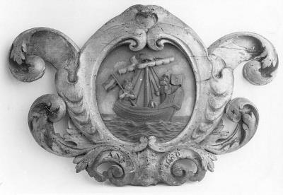 Op dit wapen uit 1686 zien we de oudste zegel van Amsterdam waarop de stichting van Amsterdam is uitgebeeld. Een ridder met het wapen van Amsterdam en een ‘boer’ met de vlag van Nederland worden vergezeld door een hond. Wanneer de Bisschop van Utrecht vermomd als arme burger met de boot naar Friesland afreist om te zien hoe de mensen daar over hem dachten, wordt hij bij aankomst uitgejoeld en terug de zee ingestuurd. Er was slechts een jongeman die voor de Bisschop opkwam en samen met hem de boot instapte, gevolgd door een trouwe hond. Samen vaarden zij door het moeras aan de Amstel en het IJ en toen de Bisschop van Utrecht bekend maakte wie hij was, beloofde hij de jongeman dat in het moeras een grote, mooie, machtige en rijke stad zou verschijnen. Om deze te besturen had de Bisschip een trouwe en deugdzame bestuurder nodig, dat de jongeman zou worden. De voorspelling is uitgekomen en sindsdien is deze ontmoeting een van de twee belangrijkste wapens van Amsterdam geworden. Overal door Amsterdam is de eeuwenoude zegel te zien. ( Quirine van Aerts)