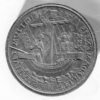 - Matrijs van zegel ten zaken van Amsterdam, en zegelafdruk, 1656