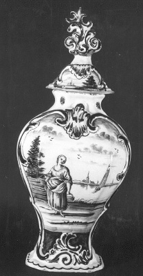 vaas van een 5-delig kaststel. Vrouw met mandje bij een meer met zeilschip- Trefwoorden
