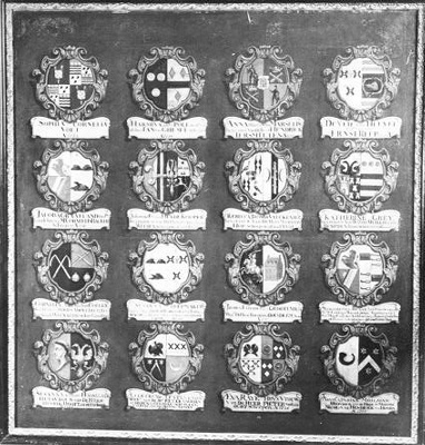 onbekende verwerving inv.nr. KA 7886 in depot Op donkergroen fond zestien wapenschilden in rijën van vier