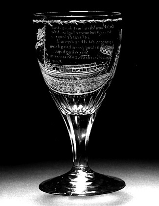 Helder kleurloos, blauwgrijs getint glas. Licht conische voet. Gefacetteerde stam, overgaand in eivormige kelk. Op kelk een trekschuit. Op vlag in mast voorsteven het opschrift: Dieu le/ Protege/ (dat God [het schip] bescherme). Op vaandel onder vlag: 6 Fevr.1809/. Op vlag achtersteven de initialen: GHC/. Aan weerszijden van de trekschuit trofeeën met vaarmaterieel waarboven het stadswapen van Amsterdam en van Utrecht. Op andere zijde kelk het opschrift: Geluk! mijn Vriend met desen stond!/ Gy zaagt het nieuwe Jagt zo straks/ in t' water loopen.-/ 't genoegen dat elk ondervond./ Doet voor U 't lang gebruik van desen/ Nieuwling hopen./ Zyn maker was de RYK zo RYK in weten-/ schap/ 't geen steeds RYK van trap/ tot trap/ Tot heil van uw geslagt en vreugde/ van uw Vrinden./ VBS./. Rondom bovenzijde kelk bladranken. Gesigneerd en gedateerd op voetrand: A. Hoevenaar 1809./.