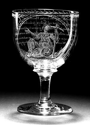 Helder kleurloos glas. Platte verdikte voet. Stam met schijf. Bolvormige kelk. Op kelk een medaillon waarin een vrouwenfiguur met een anker, de Hoop symboliserend. Rondom medaillon het opschrift: De Hoope der Rechtvaardigen is blydschap, maar de verwachtinge der Godloozen zal vergaan./ Salomon Spreuk X:28./. Op andere zijde kelk: De blÿde Hoop die 't oog ten hoogen Hemel slaat,/ Zit welgetroost en schÿnt vol heilige gedachten,/ Daar 't rÿkbebloemde Kleed en 't Groene hoofdsieraad/ Ons leert, dat ze uit de bloem de vruchten kan verwachten./ Door 't Anker wÿst zÿ elk haar vasten grondsteun aan,/ Wanneer in 's Waarelds Zee, verdrukkings-golven/ Slaan./. Gesigneerd en gedateerd op voetrand: N.L. Hoevenaar. Fezet [sic] 1849/.