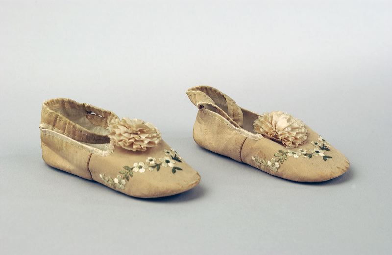 Kinderschoentjes van beige zijde de neus is geborduurd met blaadjes en bloementjes, groen en zacht beige. Als sluiting een zijden hielband.