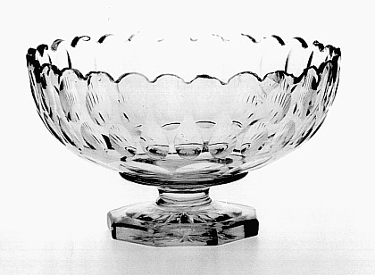 Helder kleurloos glas. Achtkantig gefacetteerde voet, de onderzijde in stervorm geslepen. Korte stam. Wijde bolvormige kelk met gegolfde rand. Kelk in olijven geslepen.- Trefwoorden
