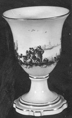 De beker voorzien van een 'encre de Chine' beschildering met een gezelschap aan een rivierover met op de achtergrond een stadje met kerk en gebouwen.- Trefwoorden