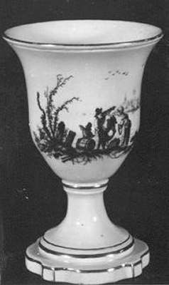 De beker voorzien van een 'encre de Chine' beschildering met een gezelschap aan een rivierover met op de achtergrond een stadje met kerk en gebouwen.- Trefwoorden