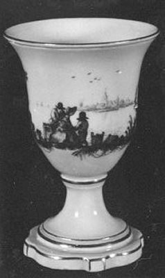 De beker voorzien van een 'encre de Chine' beschildering met een gezelschap aan een rivierover met op de achtergrond een stadje met kerk en gebouwen.- Trefwoorden