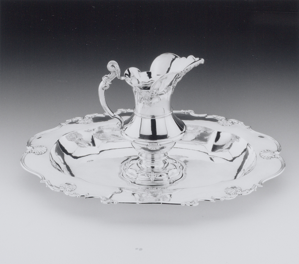 Dit lampetstel is vermoedelijk als doopstel in een kerk gebruikt. In de achttiende eeuw werd aan tafel niet meer met de handen gegeten; derhalve waren lampetten voor huiselijk gebruik overbodig geworden. Er zijn verschillende opvattingen over datering en toeschrijving van dit lampetstel geweest. In 1950 werd verondersteld dat het in 1761 door Reynier Brandt gemaakt was (Amsterdams 1950, p. 50 nr. 127). Zo komt het ook voor in de veilingcatalogus van de collectie Dreesmann (Fred. Muller 1960, p. nr. 152).