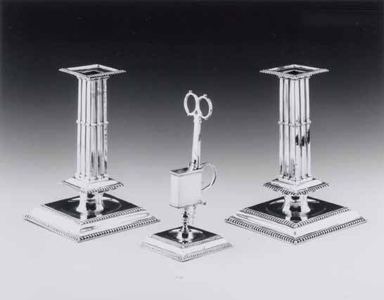Deze kandelaars zijn late voorbeelden van een type dat sedert de tweede helft van de zeventiende eeuw in Europa een grote populairiteit genoot. Bijzonder aan dit stel is dat er een bijpassende snuiter met standaard bij is ontworpen. Kandelaars met vierkante voet zijn uit verschillende Nederlandse productiecentra bekend (Ter Molen 1994, p. 130-131 nr. 38, tevens voor andere voorbeelden).