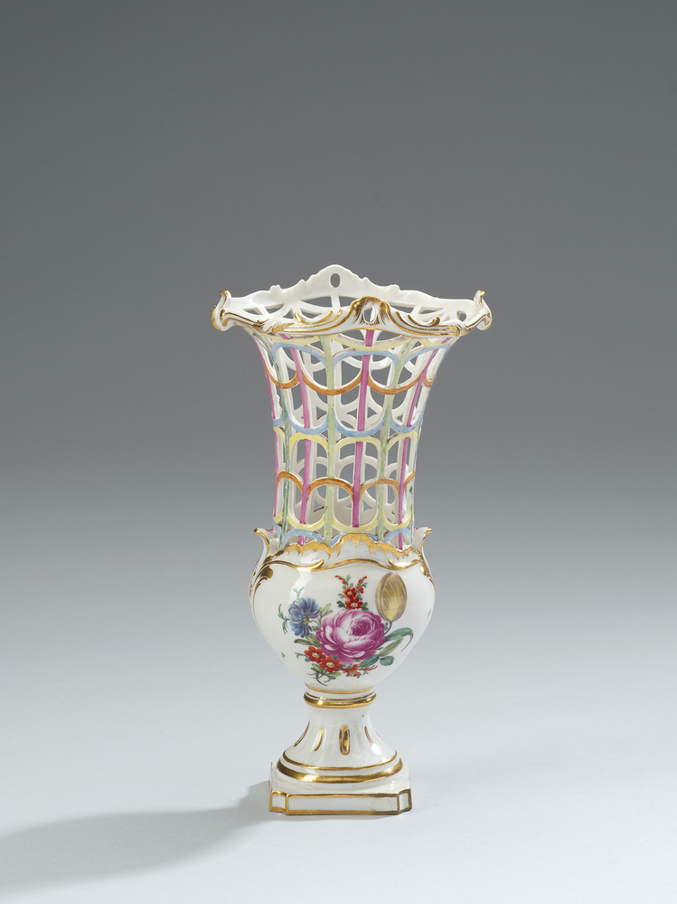Een set van vijf vazen, waarvan drie met een opengewerkt deksel en wanden. Verguld rocaille ornament in relief. Beschilderd met bloemboeketten. De grootste vaas op de voet met groen geschilderde rocailles. Gemerkt: M:OL.