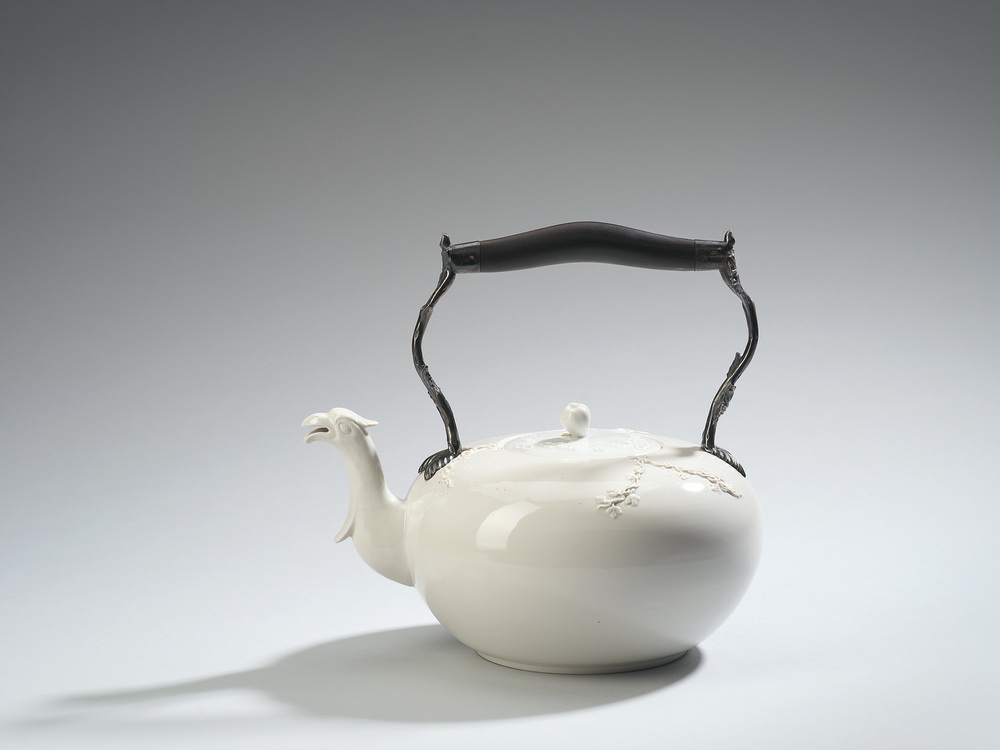 Ronde waterketel met bladslingers in relief. De tuit eindigt in de kop van een watervogel. Merk: Twee gekruisde degens met drie bollen.- Trefwoorden