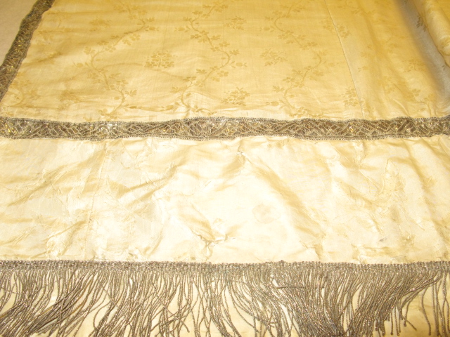 Gordijn van damast geweven zijde, geel en bruin gekleurd met bloem patroon. Zilverkleurige metalen galon banden aan onderkant en in lengte, onderste galon afwijkend patroon. Gordijn is verdeeld in verschillende panelen.- Trefwoorden