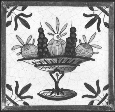 wandtegel in lijst met een voorstelling van een schaal met vruchten op hoge voet- Trefwoorden