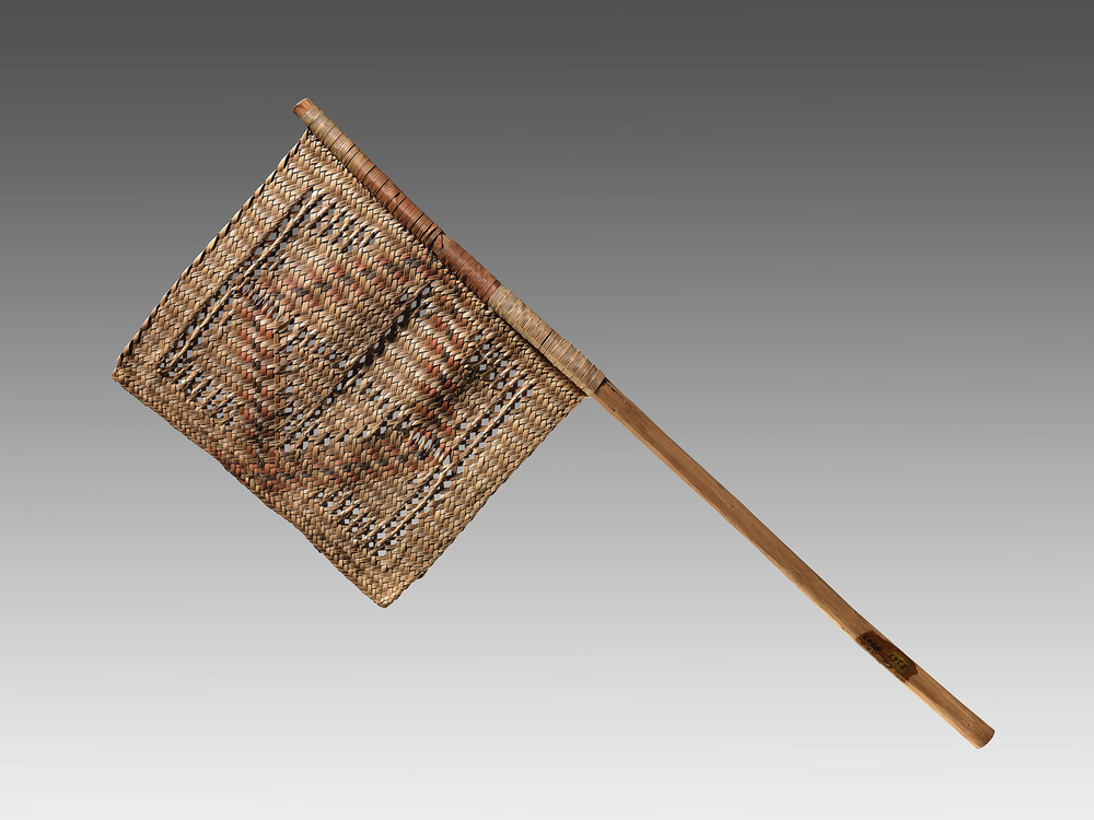 Rechthoekige waaier van ingevlochten, gekleurd riet. Het blad is bevestigd aan een houten stok.- Trefwoorden
