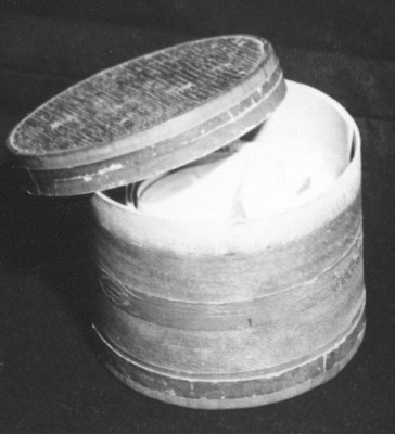 Rond doosje met deksel, beschilderd met blauwe en zilveren papieren biezen. Op de zilveren papieren bies staat een stempeltje met opschrift.- Trefwoorden