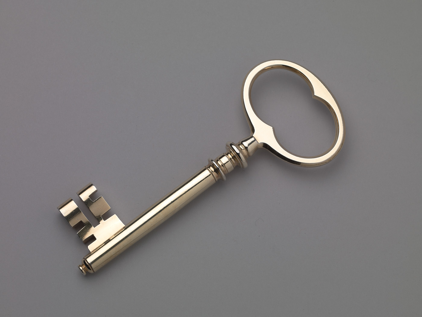 Sleutels met oog, pijp en baard. Zevenzijdig ovaal oog, de binnenzijde in de vorm van een tweepas. Cilindrische pijp met geprofileerde nodus en schijf tussen geribde randen. Pijp eindigend in afgeplat knopje. Baard met asymmetrische inkepingen, de ene recht, de andere gebogen. Bij de sleutels bleef een rood fluwelen presentatiekussen bewaard met stiksels en kwasten van gouddraad (inv.nr. KA 8492 of KA 8493).