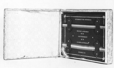 Album met leren band met opdruk, in kartonnen doos. In album zijn 16 fotoportretten van officieren geplakt, met bijschriften. Opdruk in goud : STUDIEREIS NAAR AMSTERDAM/ BLIJVEND AANDENKEN/ VAN DE/ GEINTERNEERDEN/ UIT DE/ LEGERPLAATS-BIJ-ZEIST/ DECEMBER 1917/.