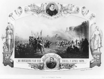 opschrift mid. o. in de steen: de inneming van den briel. 1 april 1572