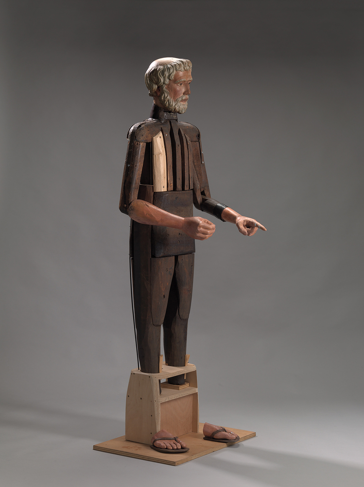 Houten pop met gebeeldhouwd, gepolychromeerd hoofd met korte baard en golvend haar, de kruin is kaal. Het lichaam is opgebouwd uit ruw gemodelleerde blokken hout, die gedeeltelijk met ijzeren banden aan elkaar verbonden zijn. Om de hals is een koperen plaat. In de rug bevindt zich een mechanisme waarmee hoofd en linkeronderarm op en neer bewogen kunnen worden. Voeten, rechteronderarm en deel van linkeronderarm van kunststof zijn latere toevoeging.