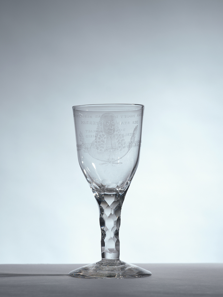Helder kleurloos glas. Licht conische voet. Stam overgaand in eivormige kelk. Stam en basis kelk in facetten geslepen. Op kelk in stippelgravure een portret van een heer in burgemeesterstenue met staatsiepruik, boven een gekruiste laurier- en eikentak. Op andere zijde in diamantgravure het opschrift: HENDRIK HOOFT DANIELS.Z. BURGEMEESTER DER STAD AMSTERDAM. DOOR EENDRACHT HERLEEFT DE VRYHEID/ DITS' HOLLANSCH CATO HOOFT GEVLUGT OM DWINLANDY/ KEERT HY IN ZEEGEPRAAL DAN WORD HEEL NEERLAND VRY/.