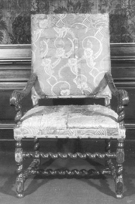 - Leunstoel met fragment bekledingsstof, 1665 - 1685