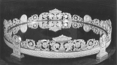 Rond, liggend, gevat in brede verguld koperen reliëf rand. Vier vierkante steunen met Januskop- HerkomstSchenking Baron E. von der Heydt, Ascona, 1962.