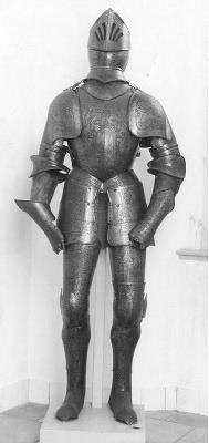 Het harnas bestaat uit de volgende twaalf delen: 1 helm met vizier, 1 kraagstuk, 2 armstukken, 2 handstukken, 1 borststuk, 1 rugstuk, 2 dijstukken, 2 beenstukken. Blank ijzer met zwart geïncustreerde rankmotieven en dolfijnen.- HerkomstSchenking Baron E. von der Heydt, Ascona, 1962.