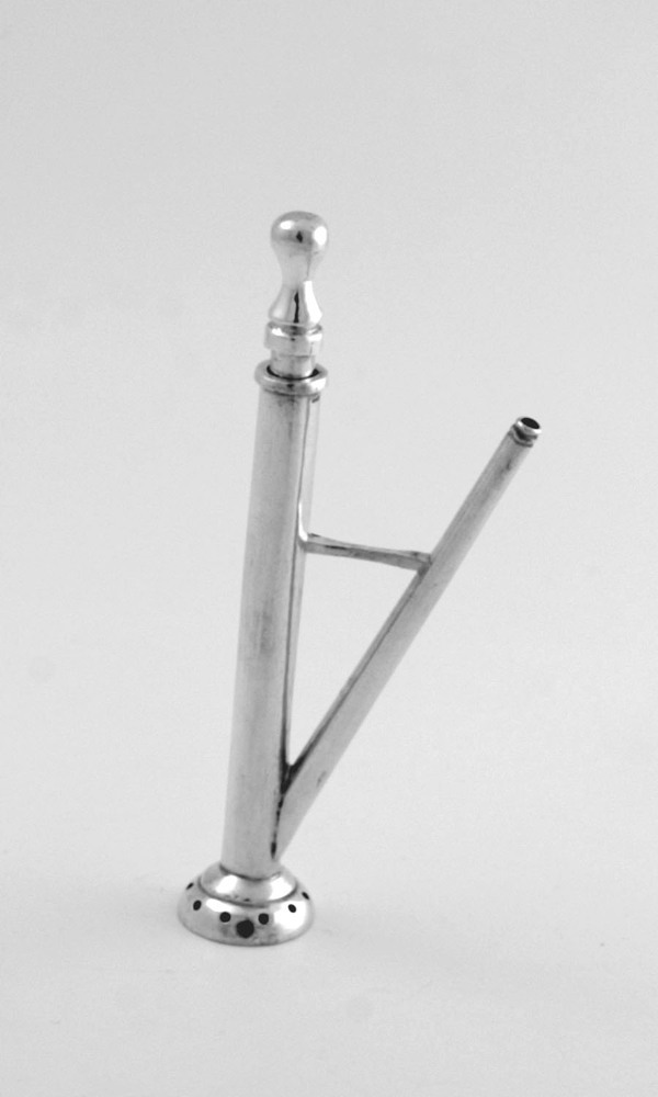 Gladde zuig- en spuitbuis op ronde geprofileerde voetmond met gaten, inlopend verbindingsstuk aangebracht op kwart van de hoogte, zuiger met een geprofileerde knop, spuitmond met twee gegraveerde ringen.
