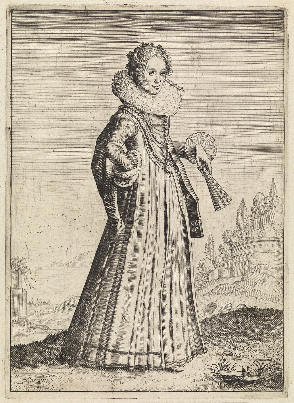 - Vrouw in landschap gedeeltelijk van voren gezien, een waaier in de linkerhand houdend, 1618 - 1652