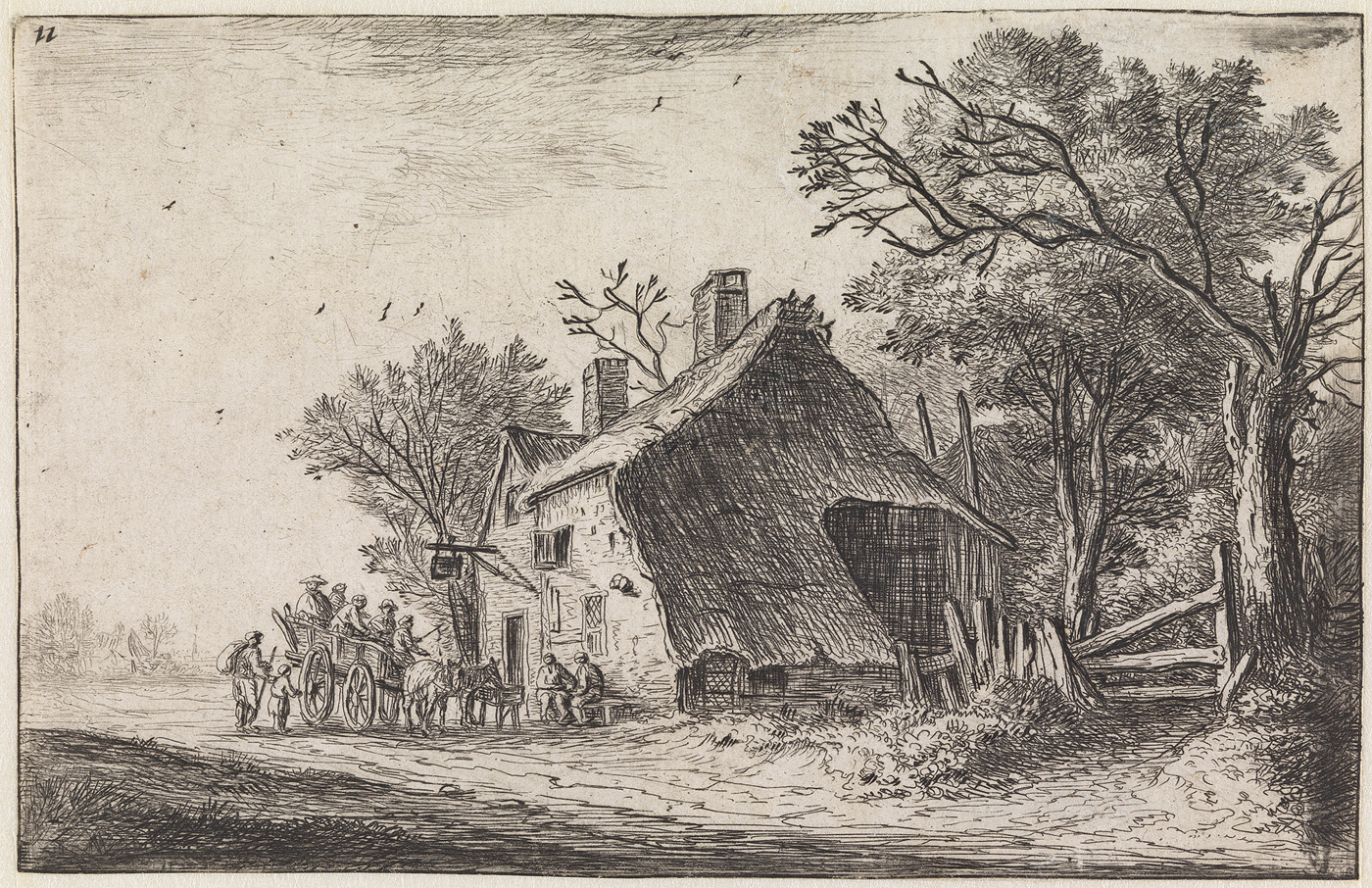 - De aankomst van de reizigers bij de herberg (nr.2 uit een serie van 12 prenten), 1629 - 1690