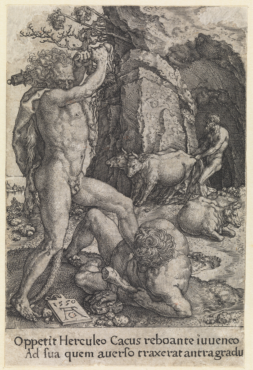 onderschrift midden onder in de plaat: Oppetit Herculeo Cacus reboante iuvenco Ad sua quem averso traxerat antra gradu: 2 regels Latijnse tekst - legaat 1895