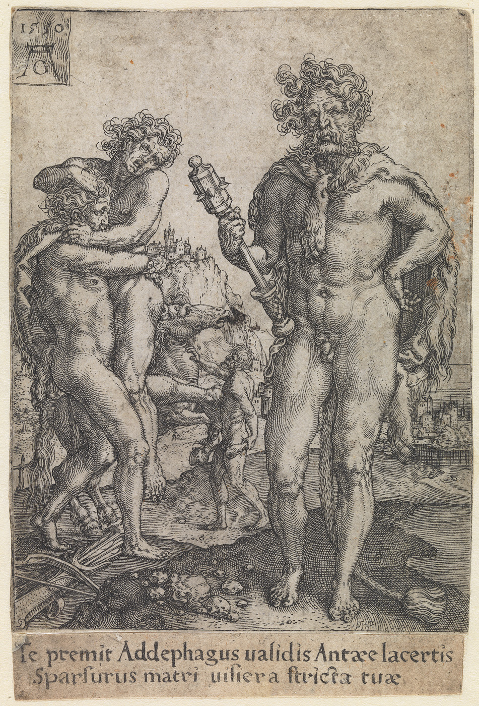 tekst midden onder de plaat: Te premit Addephagus validis Antaee lacertis Sparsurus matri visiera stricta tuae - onbekende verwerving