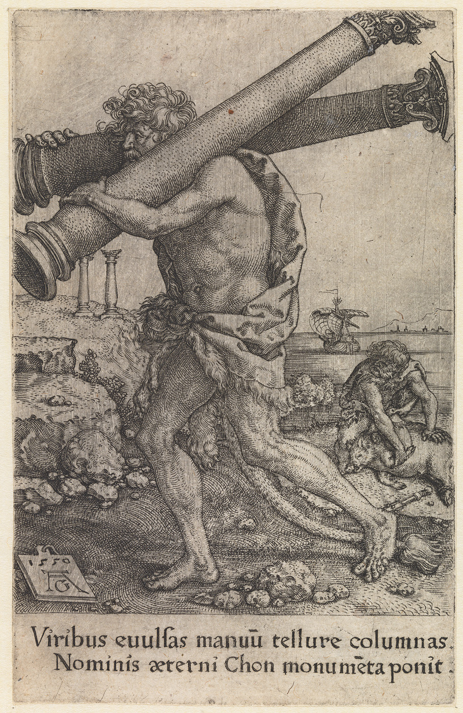 - Hercules plaatst twee zuilen bij de straat van Gades om de grenzen van zijn werken aan te geven (nr. 12 uit de serie: De werken van Hercules), 1550