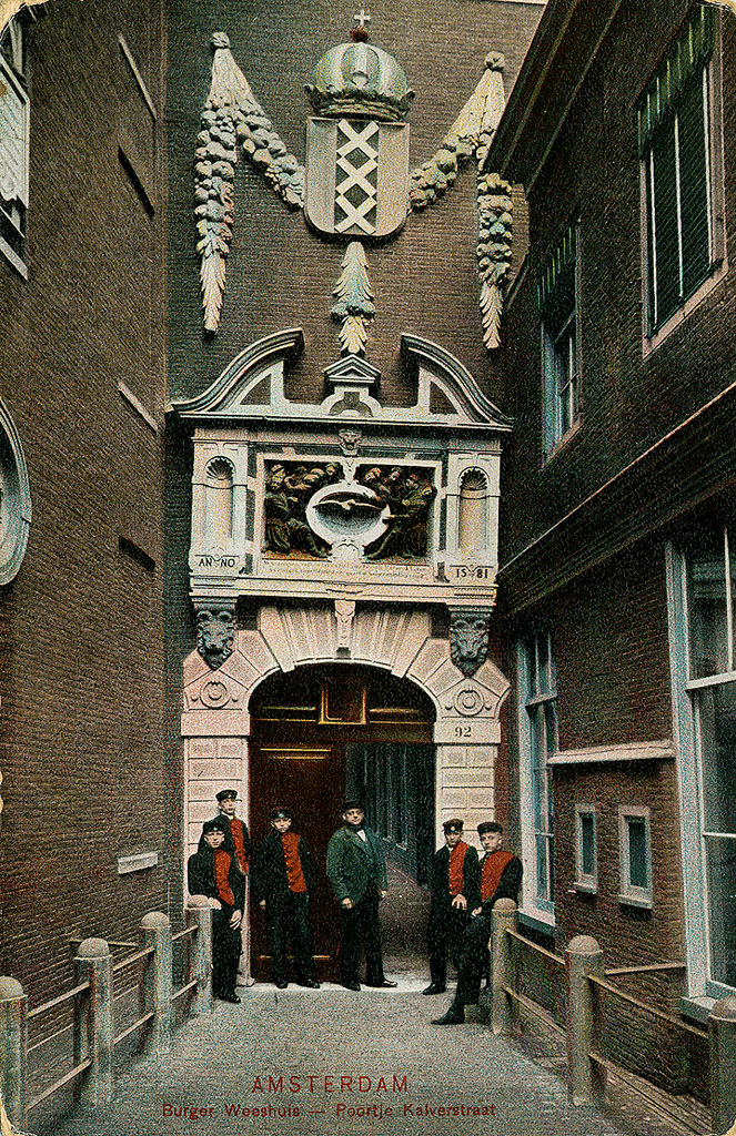 In het Amsterdamse Burgerweeshuis konden kinderen van Amsterdamse poorters (burgers met rechten om in de stad te wonen) terecht, die geen ouders of een moeilijke thuissituatie hadden. Het weeshuis was eeuwenlang een gesloten instelling, waar buitenstaanders niet zomaar naar binnen mochten. Voor de creatie van een fotoalbum, ter ere van het 25-jarige huwelijk van bouwkundige Pieter Heyn in 1904, werd een uitzondering gemaakt. Fotograaf August Stap maakte een unieke serie foto’s van het interieur, de wezen en het personeel van het Burgerweeshuis. Op de foto’s zijn de Burgerwezen tijdens hun dagelijkse bezigheden te zien. Zo komen onder meer de naailes voor meisjes, het ‘Slöjd’-onderwijs voor jongens en de zondagse gang op weg naar de kerk voorbij. Een groot aantal van de foto’s zijn later gebruikt voor de productie van een serie ansichtkaarten in kleur, waaronder deze ansichtkaart van een groep weesjongens bij de poort naar de Kalverstraat. ( Sarah Remmerts de Vries)