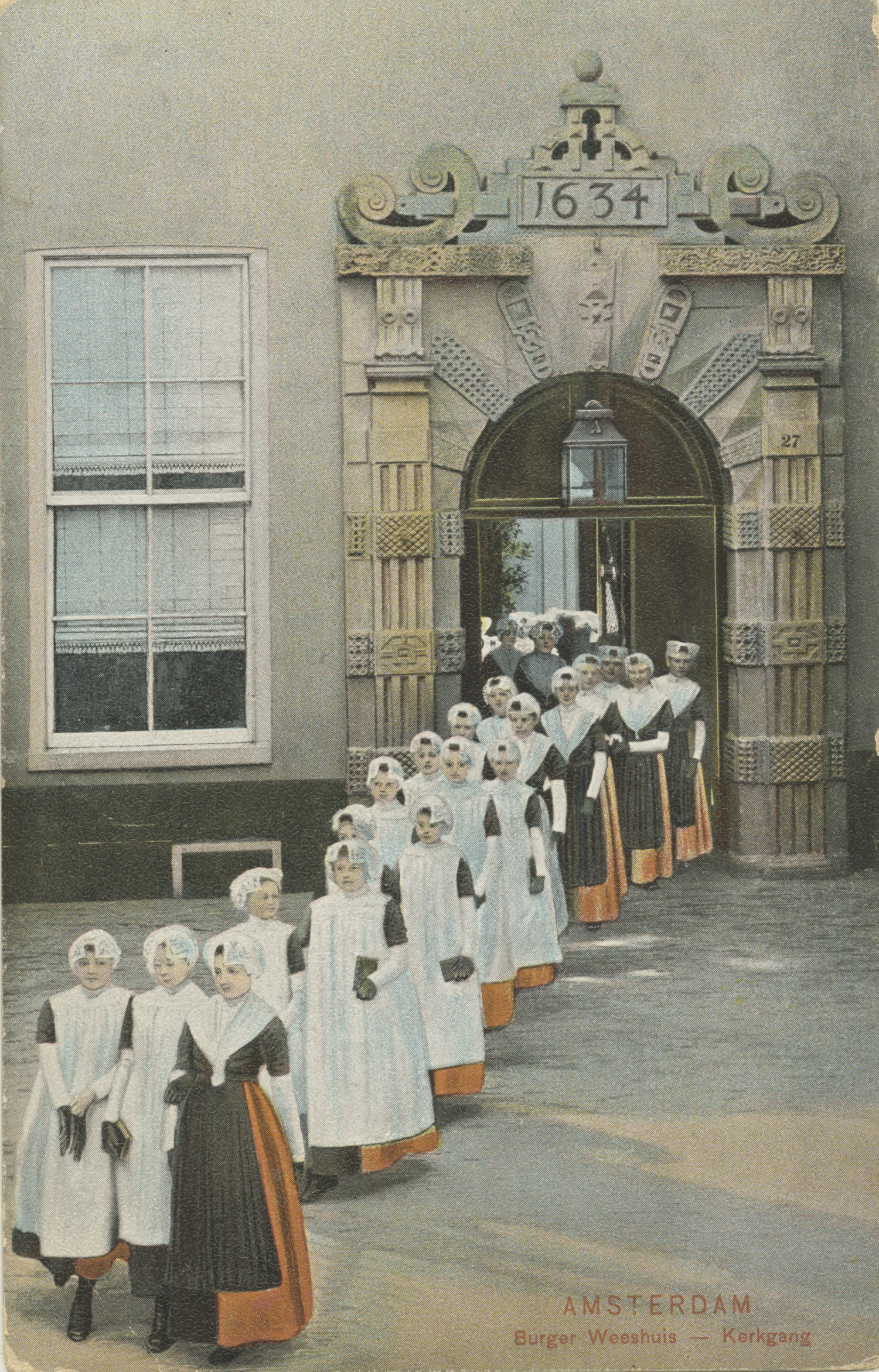 In het Amsterdamse Burgerweeshuis konden kinderen van Amsterdamse poorters (burgers met rechten om in de stad te wonen) terecht, die geen ouders of een moeilijke thuissituatie hadden. Het weeshuis was eeuwenlang een gesloten instelling, waar buitenstaanders niet zomaar naar binnen mochten. Voor de creatie van een fotoalbum, ter ere van het 25-jarige huwelijk van bouwkundige Pieter Heyn in 1904, werd een uitzondering gemaakt. Fotograaf August Stap maakte een unieke serie foto’s van het interieur, de wezen en het personeel van het Burgerweeshuis. Op de foto’s zijn de Burgerwezen tijdens hun dagelijkse bezigheden te zien. Zo komen onder meer de naailes voor meisjes, het ‘Slöjd’-onderwijs voor jongens en de zondagse gang op weg naar de kerk voorbij. Een groot aantal van de foto’s zijn later gebruikt voor de productie van een serie ansichtkaarten in kleur, waaronder deze ansichtkaart van een stoet weesmeisjes tijdens de zondagse gang op weg naar de kerk. ( Sarah Remmerts de Vries)