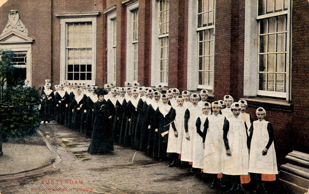 In het Amsterdamse Burgerweeshuis konden kinderen van Amsterdamse poorters (burgers met rechten om in de stad te wonen) terecht, die geen ouders of een moeilijke thuissituatie hadden. Het weeshuis was eeuwenlang een gesloten instelling, waar buitenstaanders niet zomaar naar binnen mochten. Voor de creatie van een fotoalbum, ter ere van het 25-jarige huwelijk van bouwkundige Pieter Heyn in 1904, werd een uitzondering gemaakt. Fotograaf August Stap maakte een unieke serie foto’s van het interieur, de wezen en het personeel van het Burgerweeshuis. Op de foto’s zijn de Burgerwezen tijdens hun dagelijkse bezigheden te zien. Zo komen onder meer de naailes voor meisjes, het ‘Slöjd’-onderwijs voor jongens en de zondagse gang op weg naar de kerk voorbij. Een groot aantal van de foto’s zijn later gebruikt voor de productie van een serie ansichtkaarten in kleur, waaronder deze ansichtkaart van weesmeisjes tijdens de zondagse gang naar de kerk. ( Sarah Remmerts de Vries)