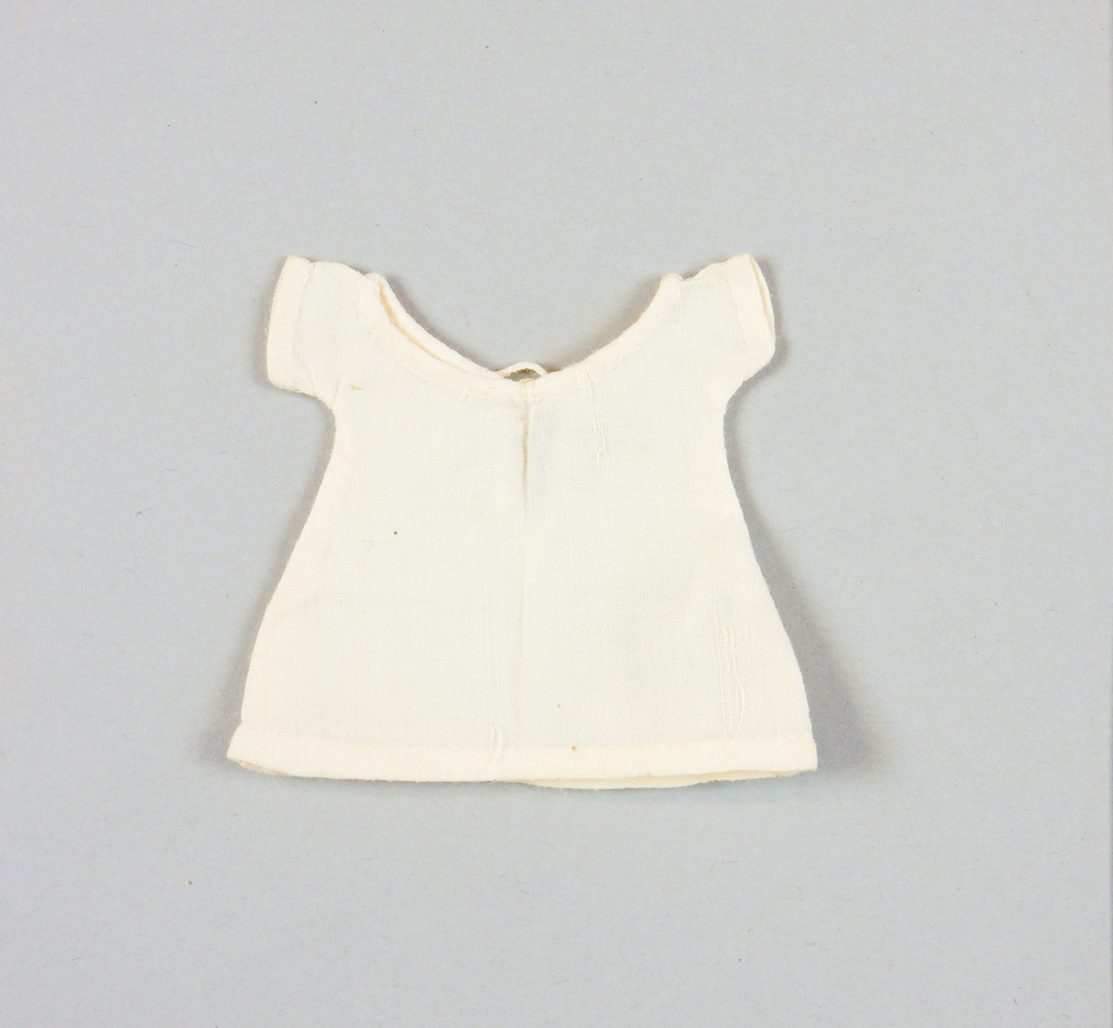 Gesloten wijd uitstaand model van katoen, zeer korte mouwtjes. Ronde lage hals, achter bij wijd splitje door wit koordje ingehaald.