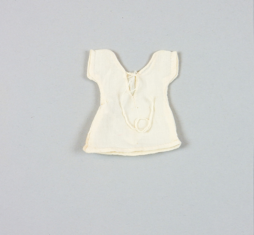 Wijd uitstaand, gesloten model van katoen. Achter bij wijd splitje ingehaald door wit koordje. Ronde hals. Korte mouwtjes.- Trefwoorden